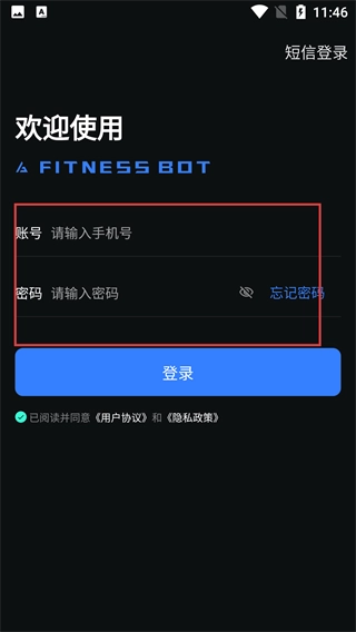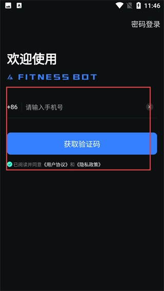 1、打開【FITNESS-BOT】的登錄頁面,挑選短信登錄的方式,在手機(jī)號對應(yīng)的輸入框中填寫好號碼,接著點(diǎn)擊【獲取驗(yàn)證碼】按鈕。