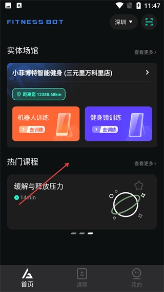 4、登錄后進(jìn)入首頁,可查看【實(shí)體場館】及【熱門課程】板塊,選擇對應(yīng)場館的【機(jī)器人訓(xùn)練】或【健身鏡訓(xùn)練】功能開啟訓(xùn)練。