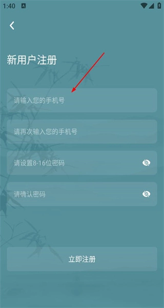 4、進(jìn)入新用戶注冊頁面,輸入手機號并重復(fù)填寫,設(shè)置符合要求的密碼后,點擊立即注冊按鈕完成操作。