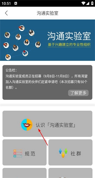 2、進(jìn)入溝通實(shí)驗(yàn)室頁面,查看成員招募公告信息,點(diǎn)擊認(rèn)識(shí)溝通實(shí)驗(yàn)室板塊,了解其相關(guān)內(nèi)容。