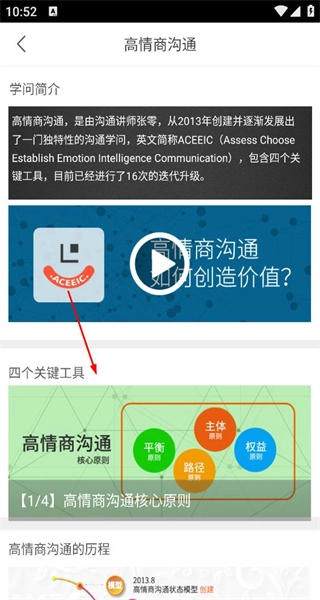 3、進(jìn)入高情商溝通頁面,查看學(xué)問簡(jiǎn)介內(nèi)容,瀏覽四個(gè)關(guān)鍵工具,查看核心原則相關(guān)展示。