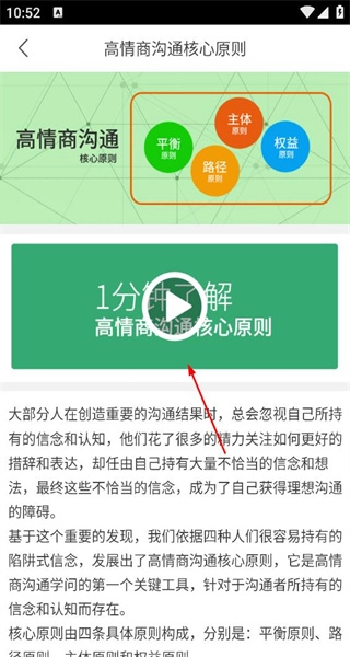 4、進(jìn)入高情商溝通核心原則頁面,查看核心原則圖示,點(diǎn)擊視頻入口,了解核心原則的作用。