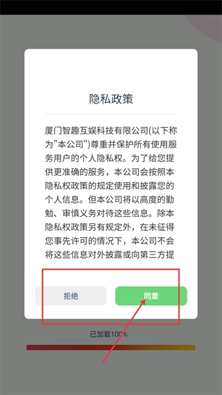 1、打開應(yīng)用時會彈出由廈門智趣互娛科技有限公司發(fā)布的【隱私政策】彈窗,需點(diǎn)擊【同意】按鈕確認(rèn)該協(xié)議,才能進(jìn)入應(yīng)用主界面。