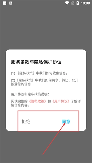 1、打開應(yīng)用時(shí)會(huì)出現(xiàn)【服務(wù)條款與隱私保護(hù)協(xié)議】的彈窗,需要點(diǎn)擊【同意】按鈕來確認(rèn)接受協(xié)議,之后才能使用應(yīng)用的所有功能。