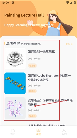 3、【課堂】頁面包含【進(jìn)階教學(xué)】板塊,提供如“如何繪制一朵玫瑰花”等零基礎(chǔ)繪畫教程,可根據(jù)需求選擇對應(yīng)教程進(jìn)行學(xué)習(xí)。