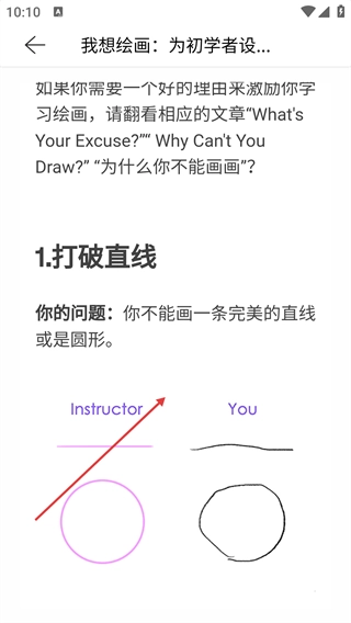 4、進(jìn)入具體教程頁面,可學(xué)習(xí)基礎(chǔ)繪畫技巧,例如“打破直線”的入門內(nèi)容,幫助初學(xué)者克服繪畫初期的常見問題。