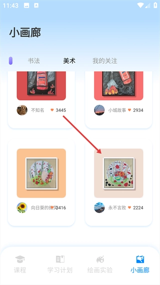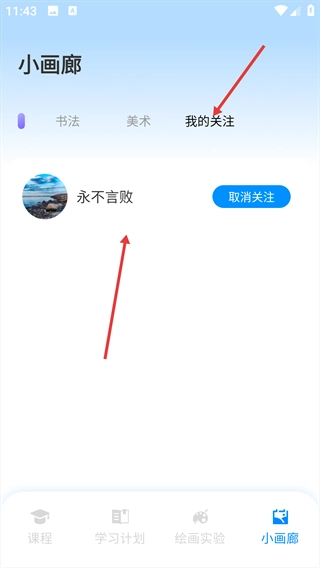 4、返回小畫廊頁面,切換至“我的關(guān)注”標(biāo)簽頁,可查看剛才關(guān)注的作者。