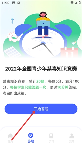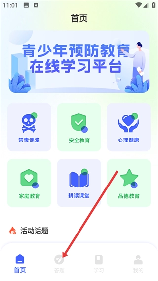 1、在【青少年預(yù)防教育在線學(xué)習(xí)平臺】的首頁,點擊底部的【答題】按鈕,即可進(jìn)入答題頁面;該首頁包含【禁毒課堂】、【安全教育】等功能板塊。