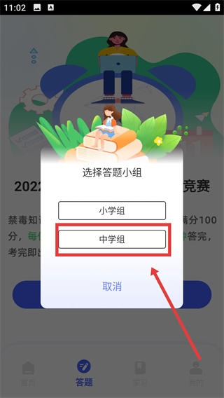 3、在【選擇答題小組】彈窗中,選定對應(yīng)組別(如【中學(xué)組】),確認(rèn)后進(jìn)入禁毒知識競賽的答題界面。