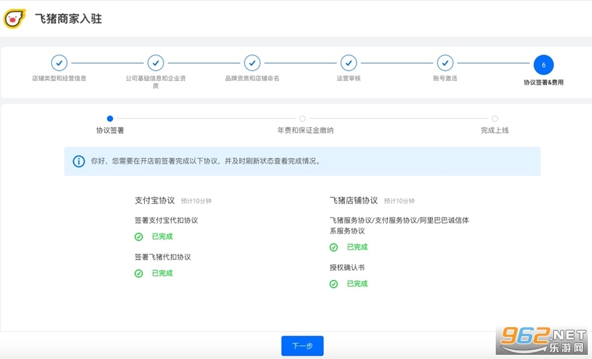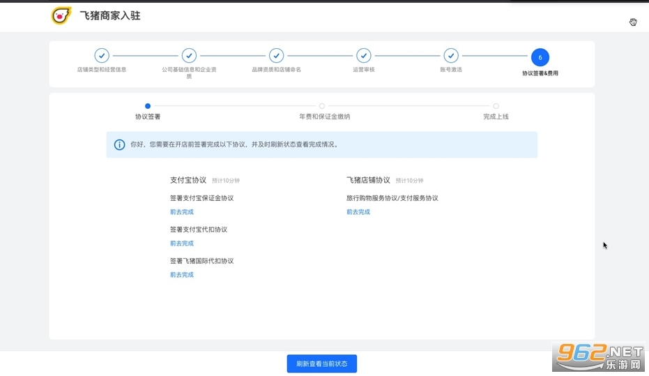 每項(xiàng)協(xié)議下“前去完成”,在新打開(kāi)頁(yè)面分別簽署支付寶協(xié)議及飛豬店鋪