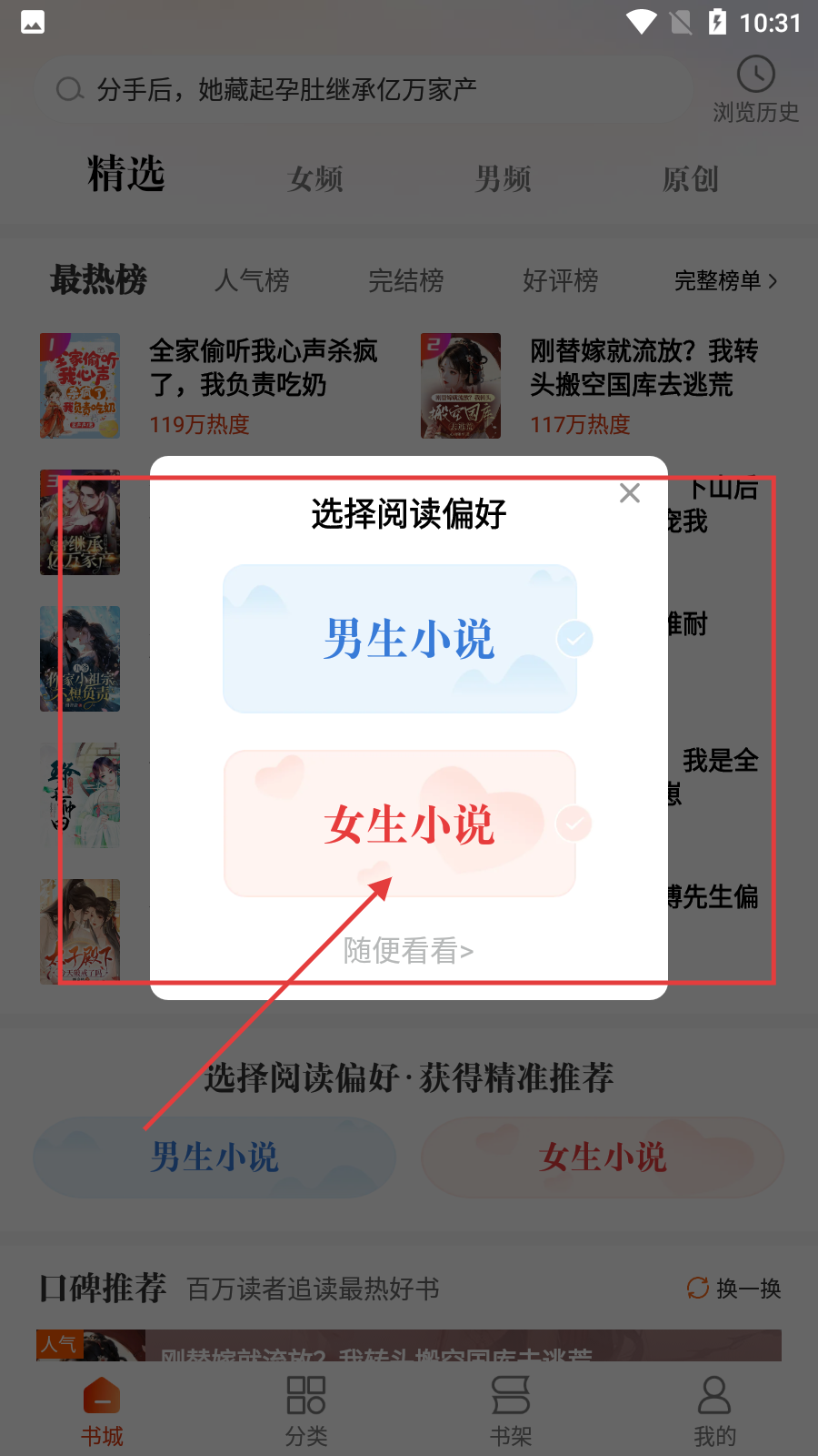 進(jìn)入軟件后,你可以通過選擇【女生小說】【男生小說】或【隨便看看】來設(shè)定自己的閱讀偏好,從而得到更精準(zhǔn)的小說推薦。