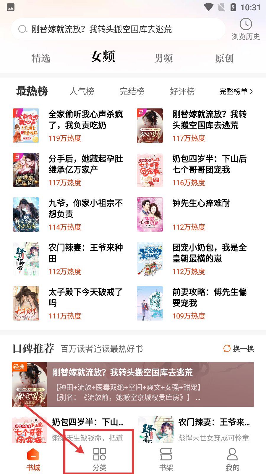 2、在書城界面,點(diǎn)擊底部【分類】按鈕,可進(jìn)入小說分類頁面,方便查找不同類型小說。