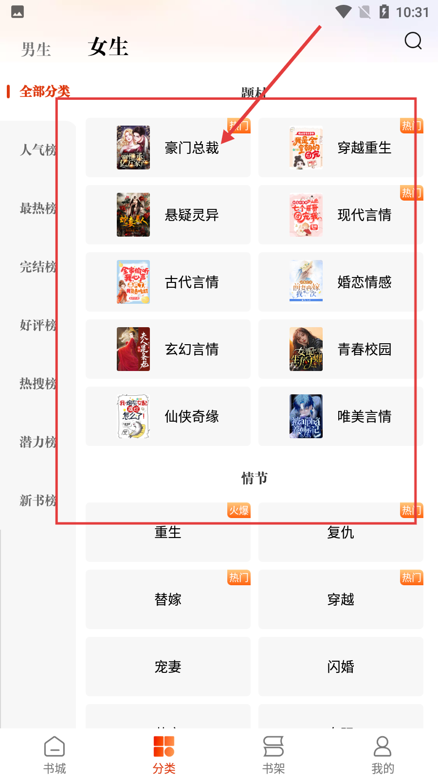 3、在女生分類頁面,可選擇【豪門總裁】【穿越重生】等不同小說類別,進(jìn)一步篩選想看的小說類型。