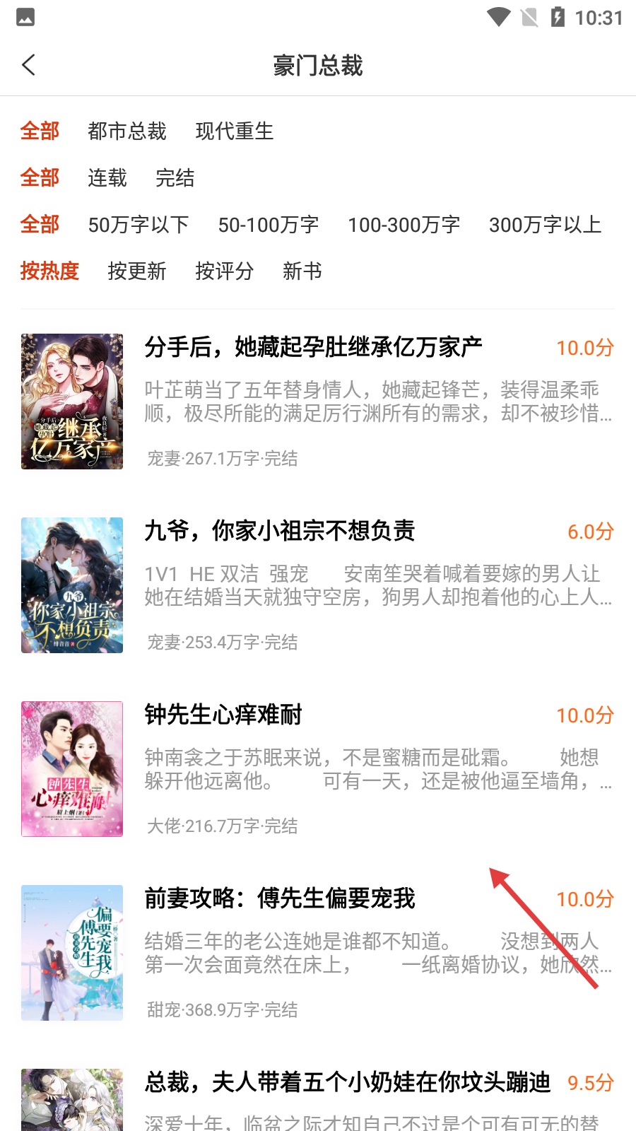 4、進(jìn)入【豪門總裁】類別后,可通過【都市總裁】【現(xiàn)代重生】等標(biāo)簽及字?jǐn)?shù)、熱度等條件,篩選出心儀的小說。