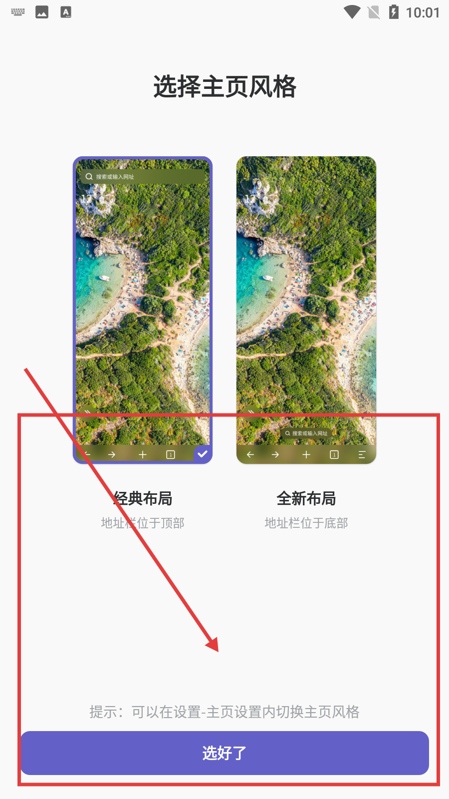 1、初次使用瀏覽器時(shí),需要選擇主頁(yè)風(fēng)格,可在經(jīng)典布局和全新布局中任選其一,選定后點(diǎn)擊【選好了】按鈕即可進(jìn)入應(yīng)用。
