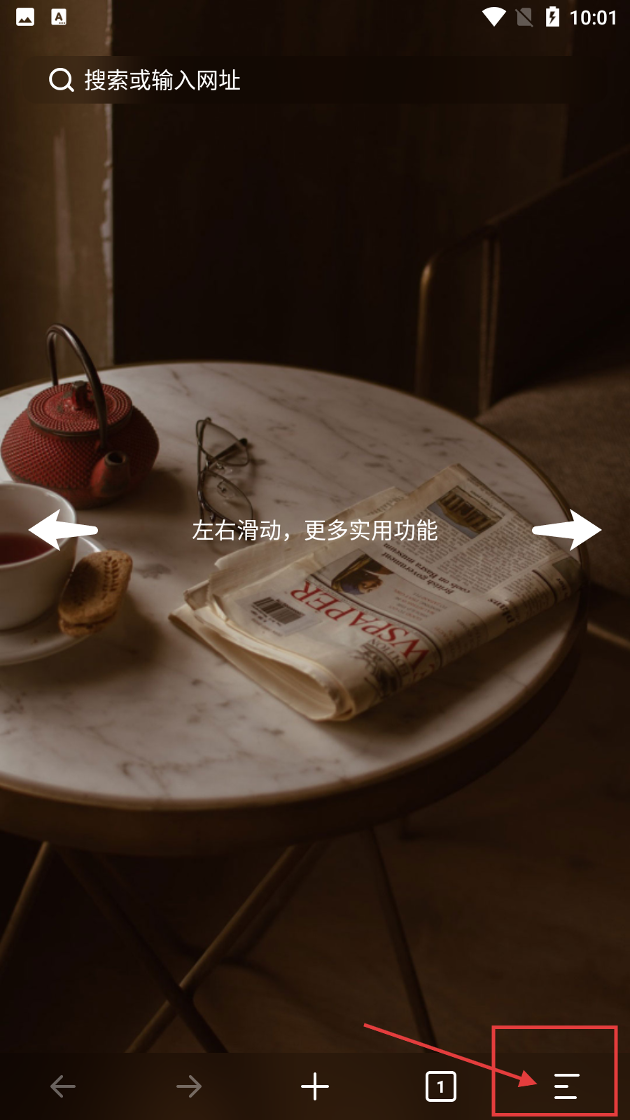 2、進(jìn)入瀏覽器主界面后,可通過(guò)頂部搜索欄搜索或輸入網(wǎng)址,點(diǎn)擊右下角三橫線圖標(biāo)可展開(kāi)功能菜單。