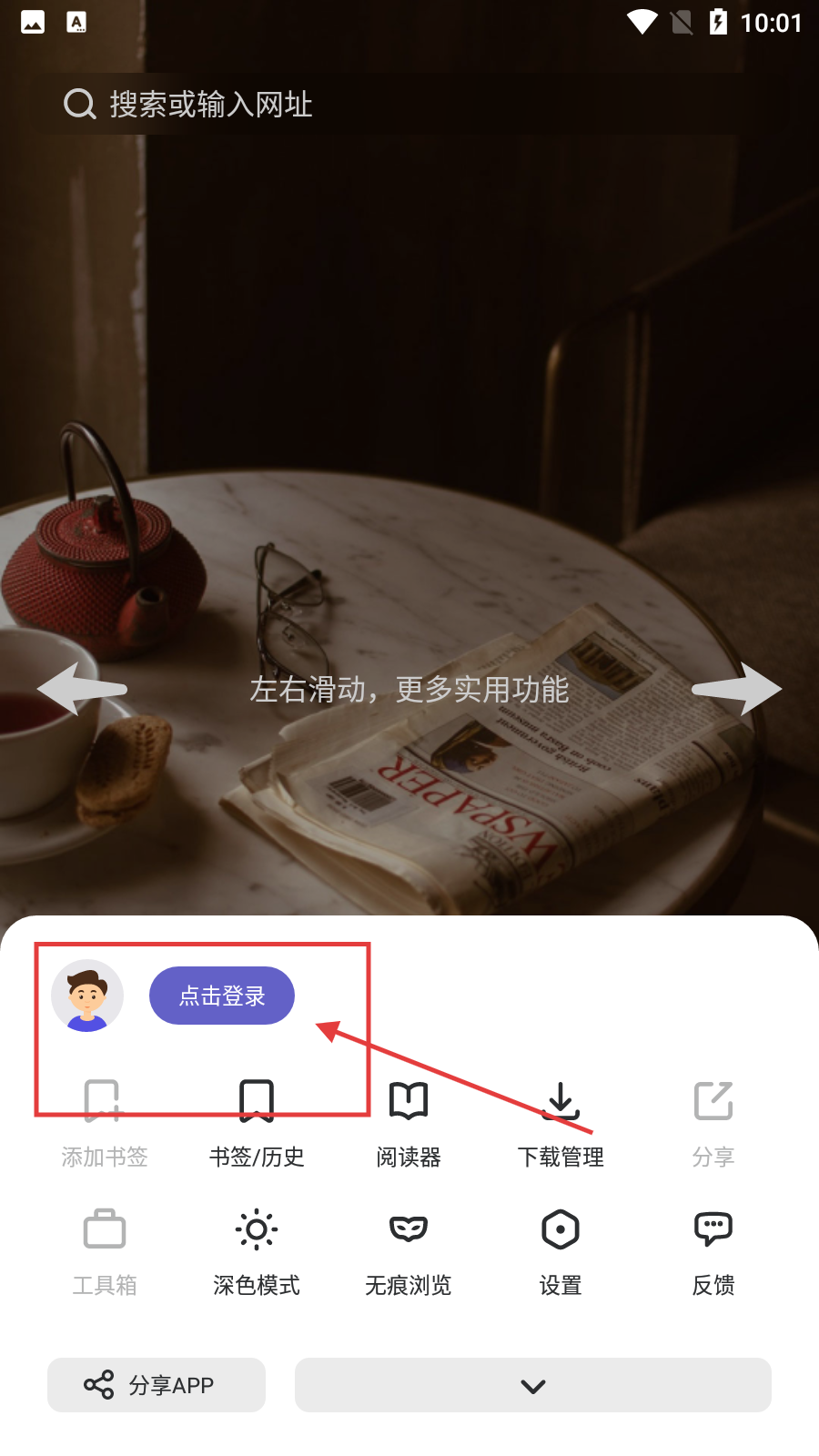 3、在功能菜單中,可點(diǎn)擊【點(diǎn)擊登錄】按鈕進(jìn)入登錄流程,以便使用書(shū)簽/歷史等個(gè)性化功能。