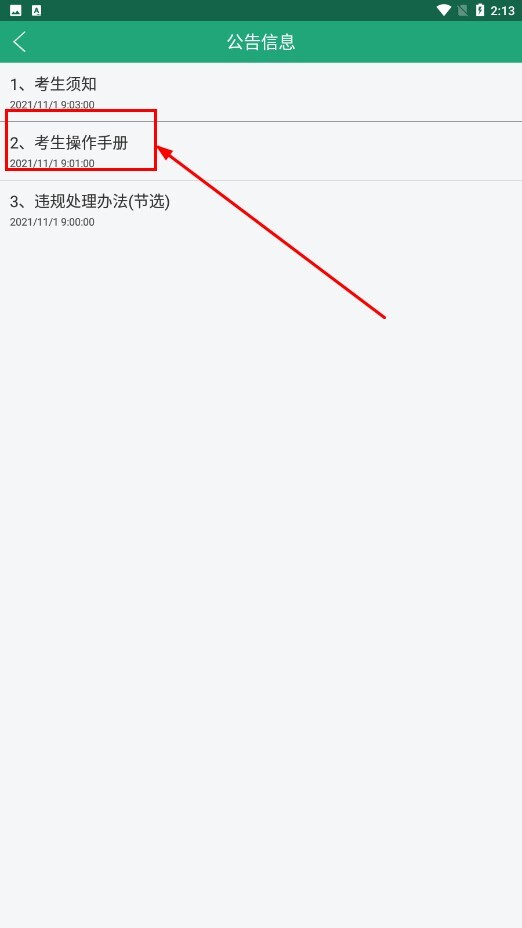 2、在公告信息頁面,點(diǎn)擊【考生操作手冊(cè)-公告條目】,查看詳細(xì)公告內(nèi)容。