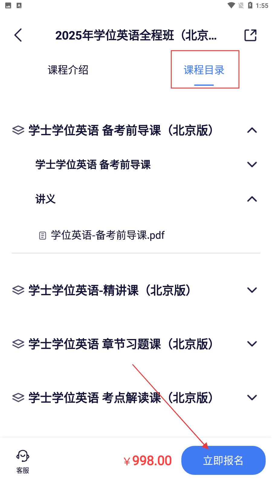 4、在課程詳情頁(yè),查看課程目錄后,點(diǎn)擊【立即報(bào)名-按鈕】,完成課程報(bào)名。