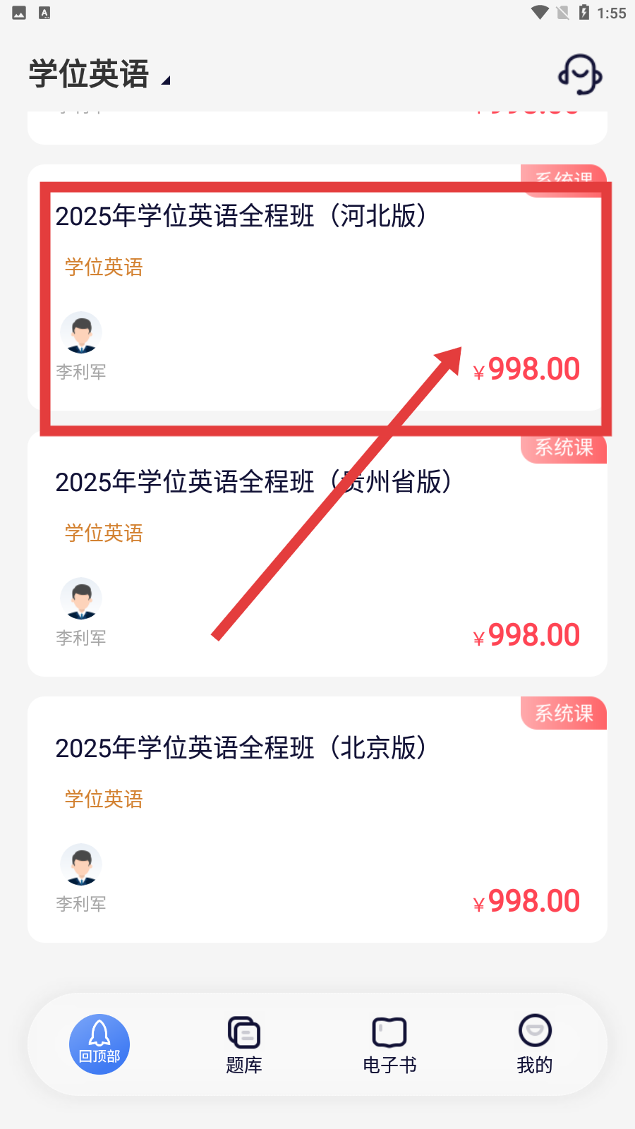 3、選擇系統(tǒng)課,如“2025年學(xué)位英語(yǔ)全程班(河北版)”,進(jìn)入課程詳情頁(yè)。