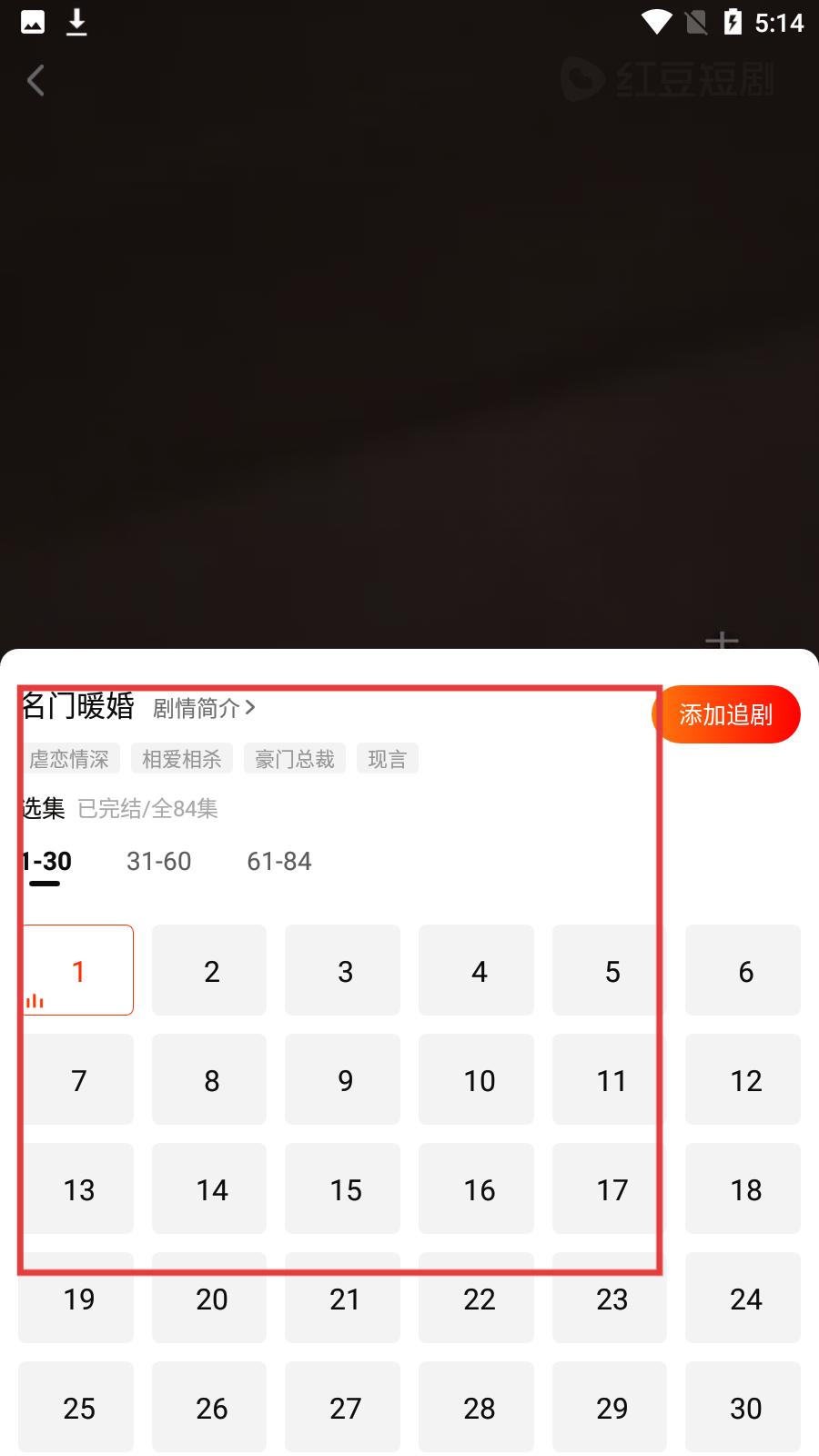 4、在選集頁面可選擇不同集數(shù)觀看《名門暖婚》,還可點擊【添加追劇】方便后續(xù)觀看。