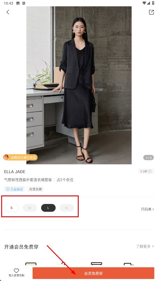 4、在服飾詳情頁,選擇合適尺碼后,可點(diǎn)擊【會(huì)員免費(fèi)穿-功能按鈕】進(jìn)行租賃操作。