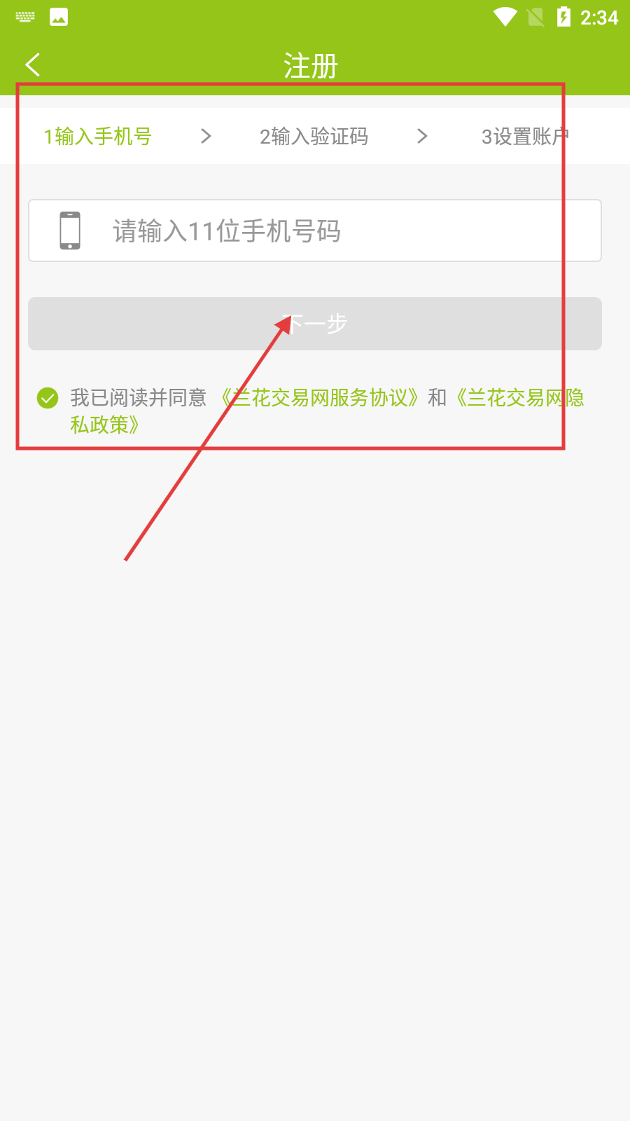 3、在注冊流程的輸入手機號界面,輸入11位手機號碼,勾選同意相關協(xié)議后,點擊【下一步】。