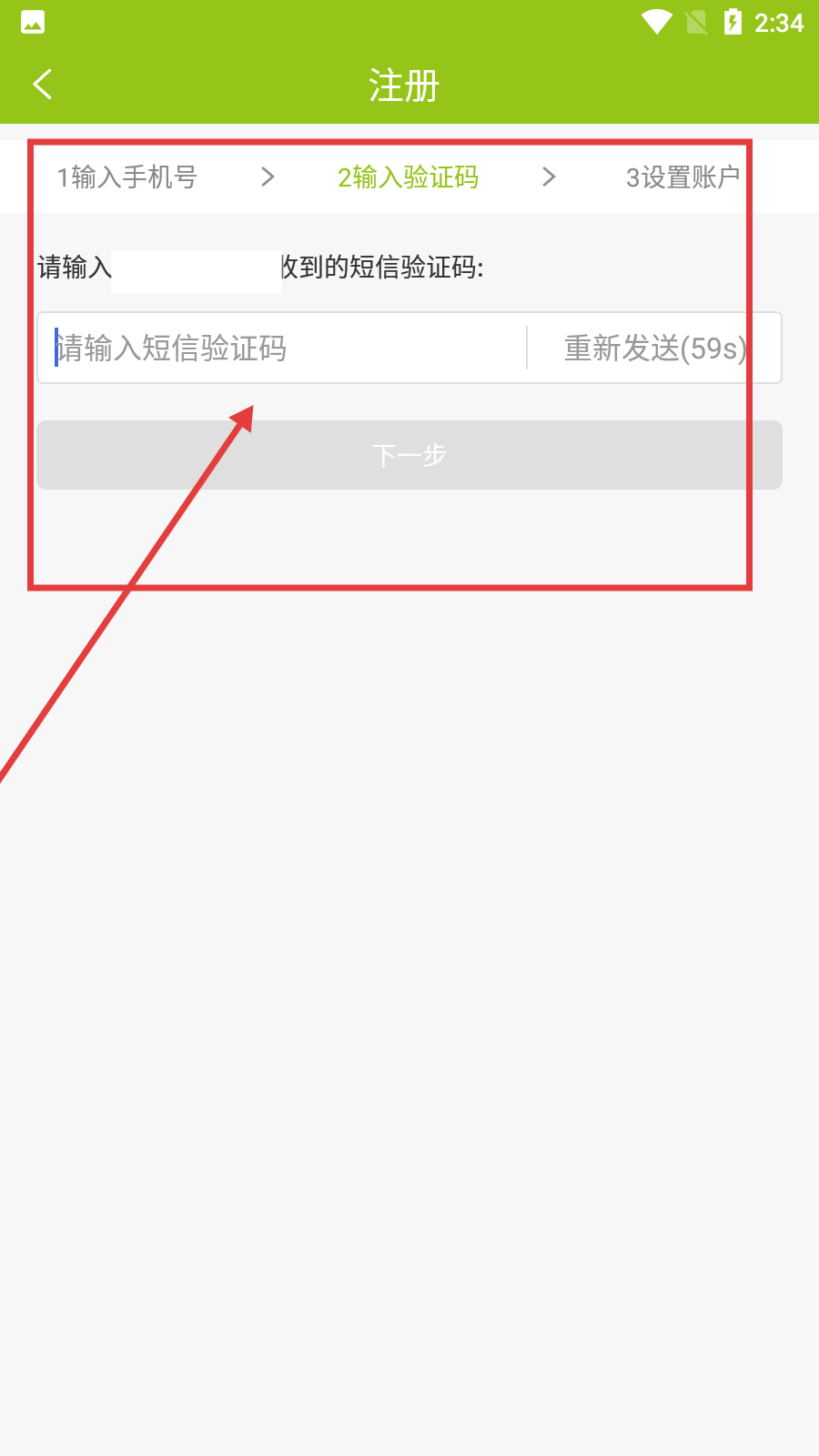 4、進入輸入驗證碼界面后,輸入收到的短信驗證碼,點擊【下一步】,即可繼續(xù)完成賬號注冊流程。