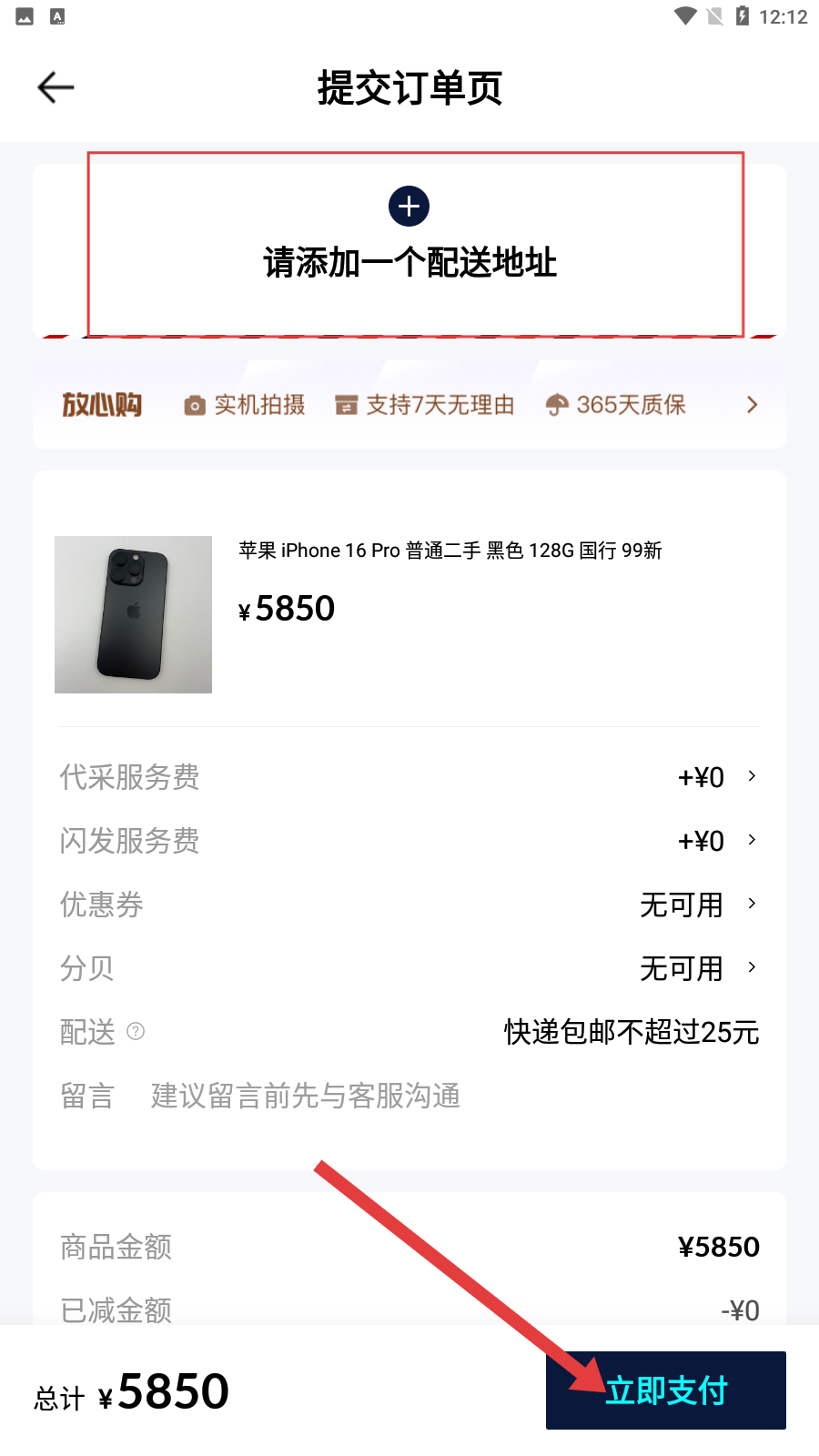 4、在提交訂單頁,添加配送地址后,點(diǎn)擊【立即支付-按鈕】,完成購買流程。