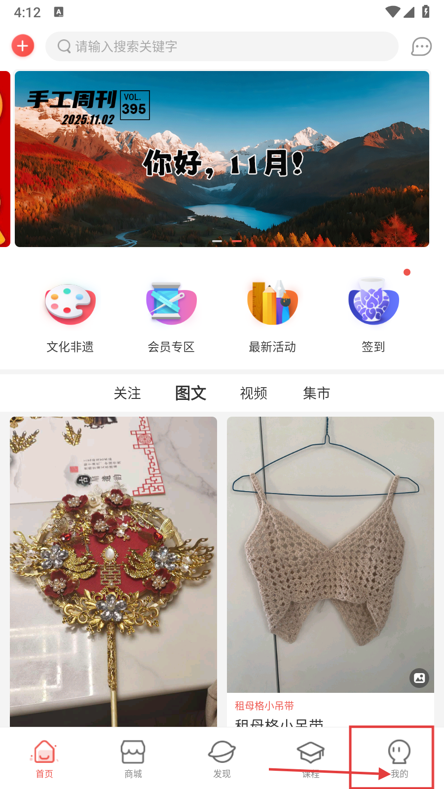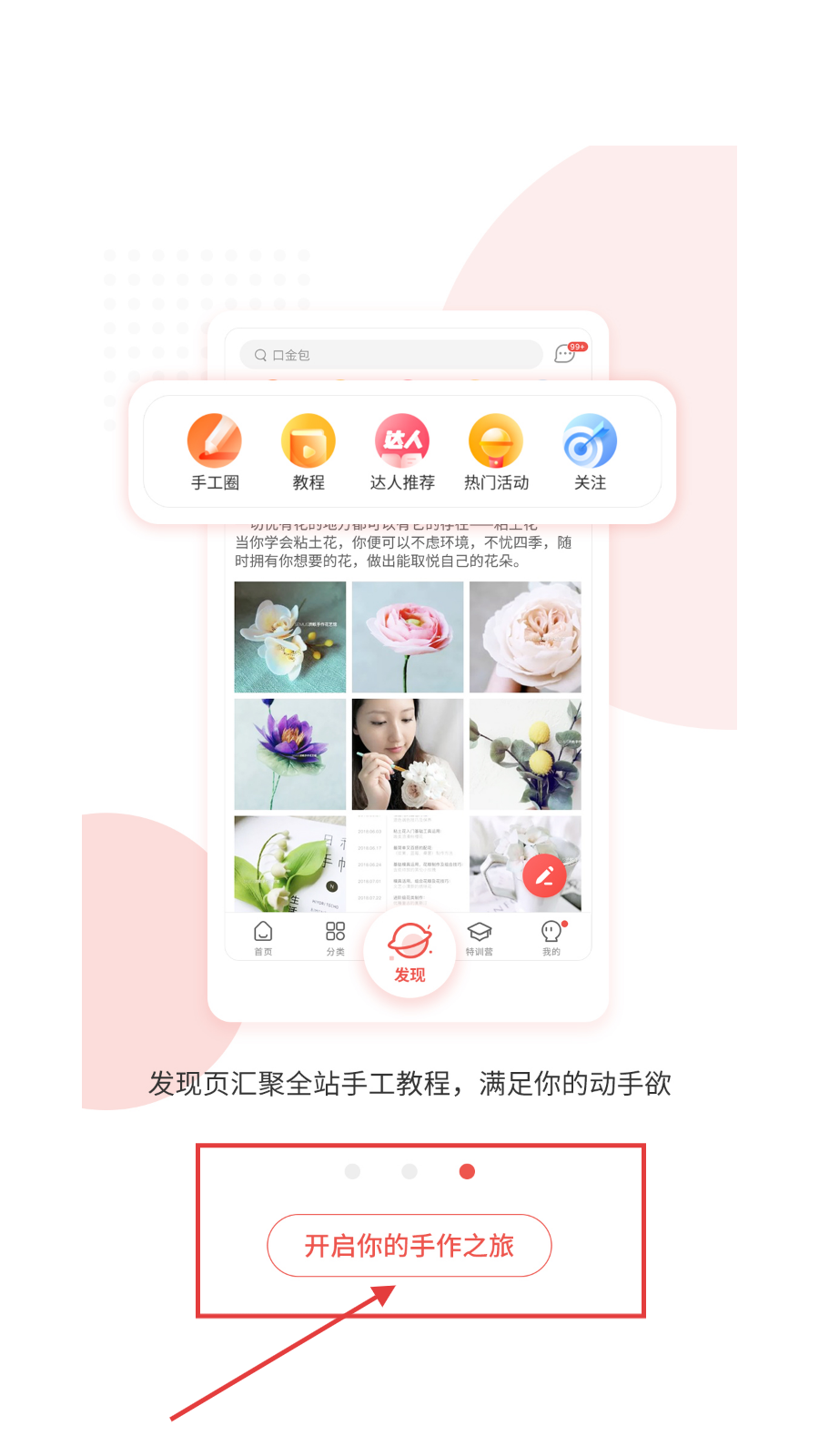 1、打開(kāi)手工客應(yīng)用后,點(diǎn)擊【開(kāi)啟你的手作之旅】按鈕,就能進(jìn)入應(yīng)用主界面,進(jìn)而探索手工圈、教程等各類豐富功能。