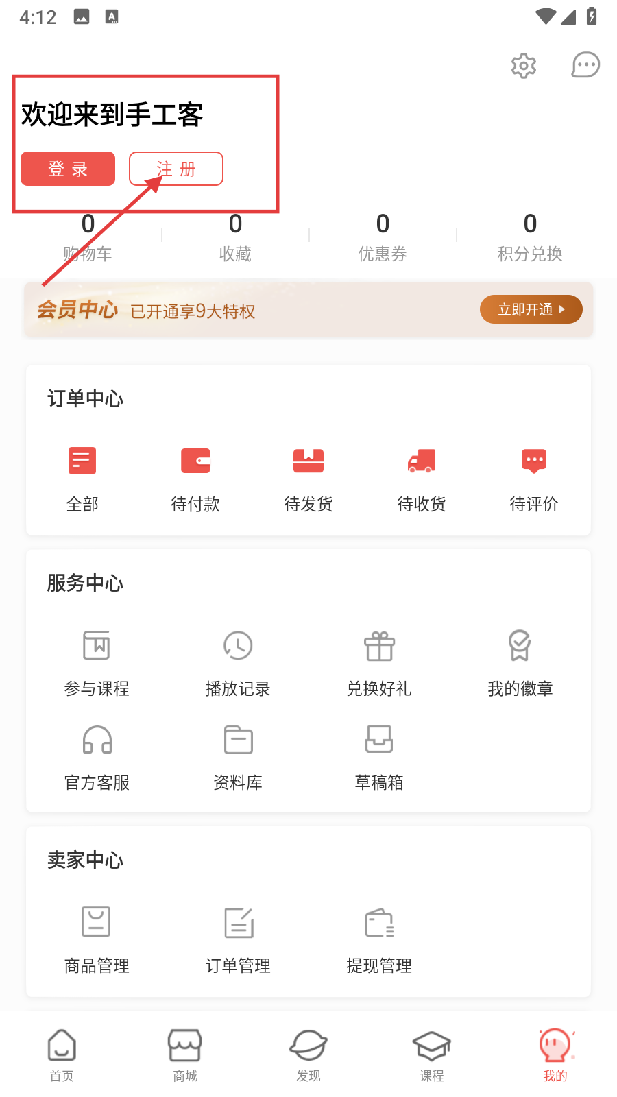 3、在個(gè)人中心界面,點(diǎn)擊【注冊(cè)】按鈕,可進(jìn)入注冊(cè)流程,開(kāi)啟手工客的使用之旅。