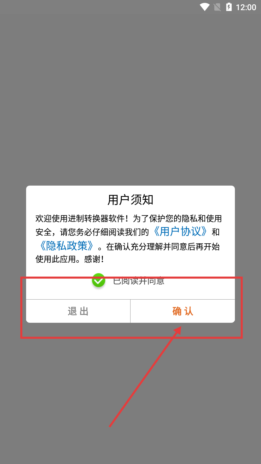 1、第一步請閱讀用戶須知,勾選“已閱讀并同意”選項后點擊【確認】按鈕,即可進入主界面。