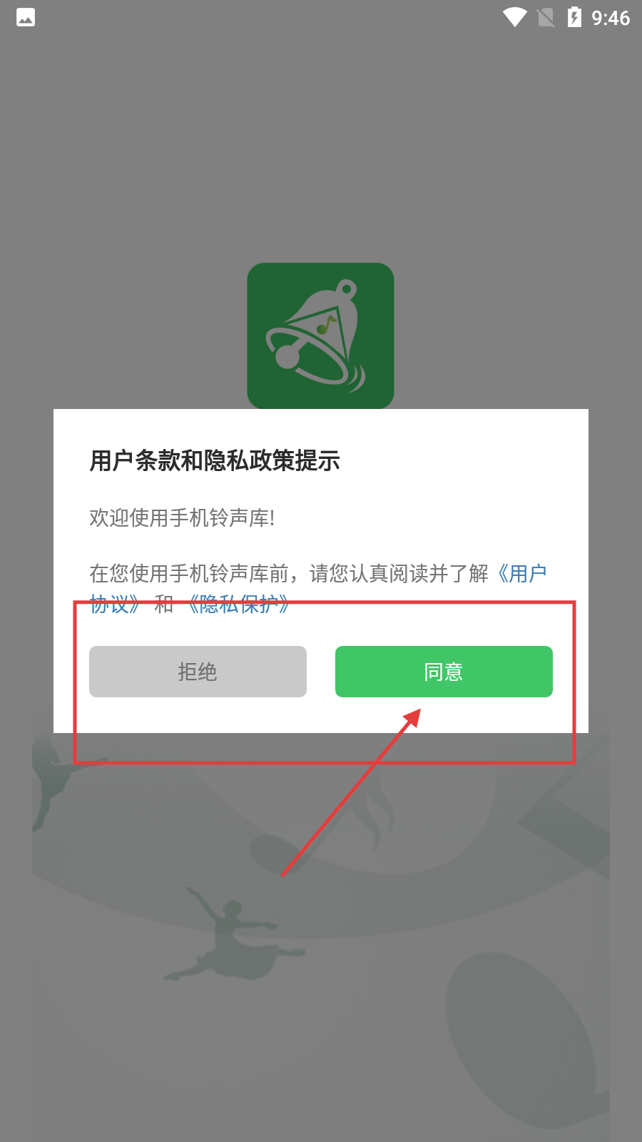 在使用【手機(jī)鈴聲庫】前,您需要點(diǎn)擊【同意】按鈕,以此確認(rèn)您已接受【用戶協(xié)議】與【隱私保護(hù)】的相關(guān)條款,完成這一步驟后,才能正常使用該軟件提供的服務(wù)。