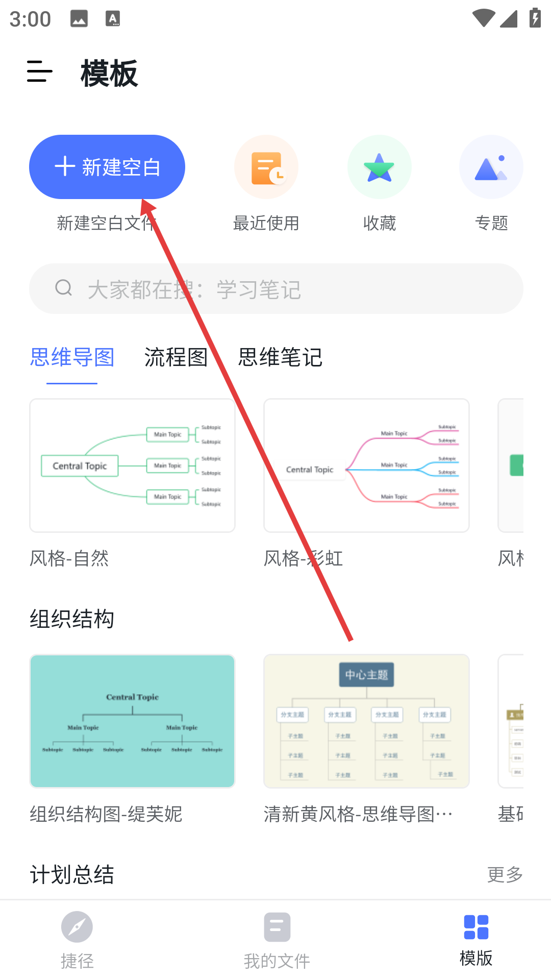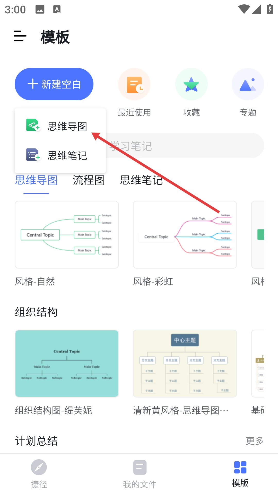 1、點擊【新建空白】選項,接著選擇【思維導圖】類型,即可進入思維導圖的編輯界面。