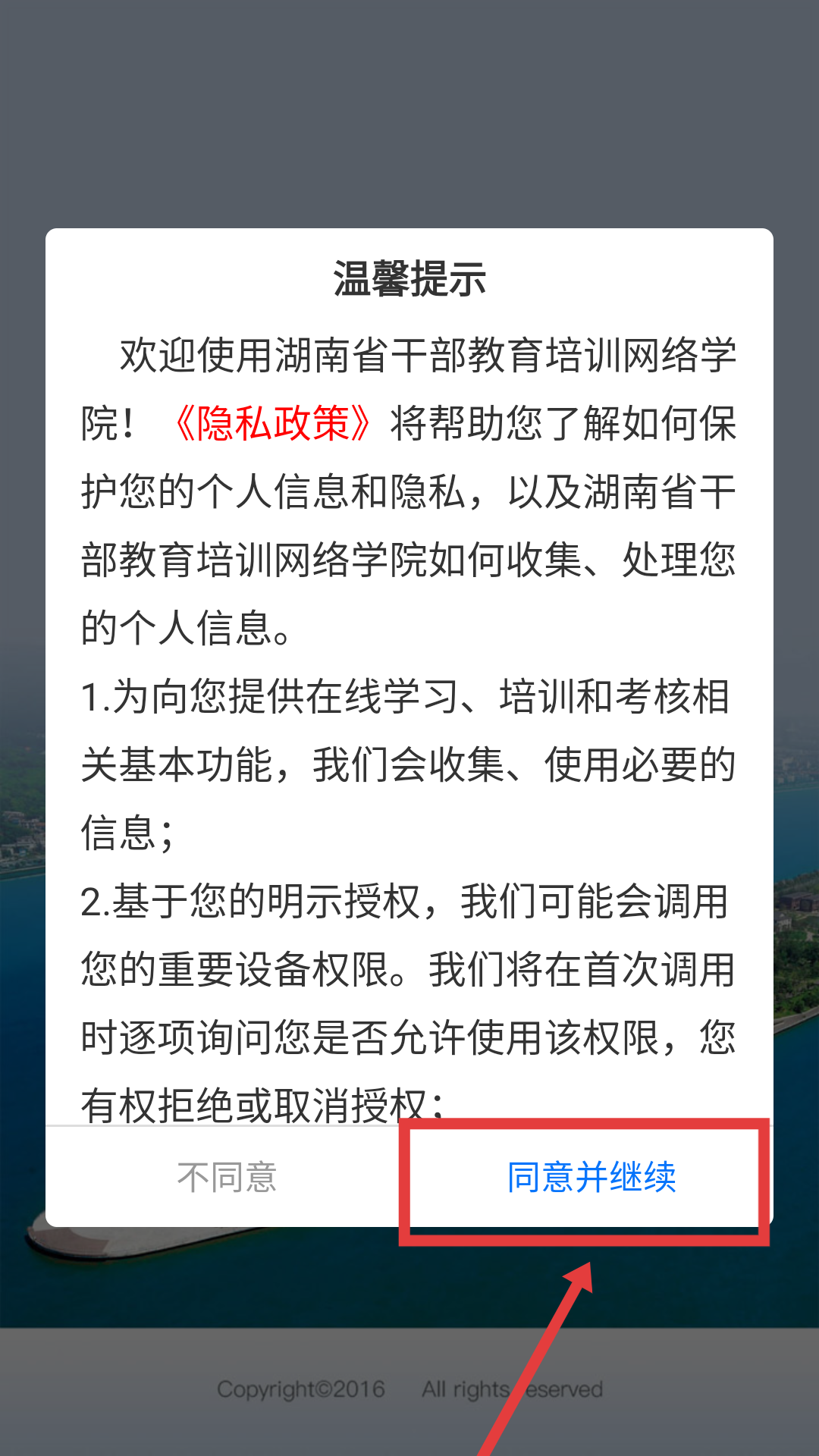 1、在湖南省干部教育培訓網絡學院彈出的【溫馨提示】窗口里,點擊【同意并繼續(xù)】按鈕,即可進入下一步操作。