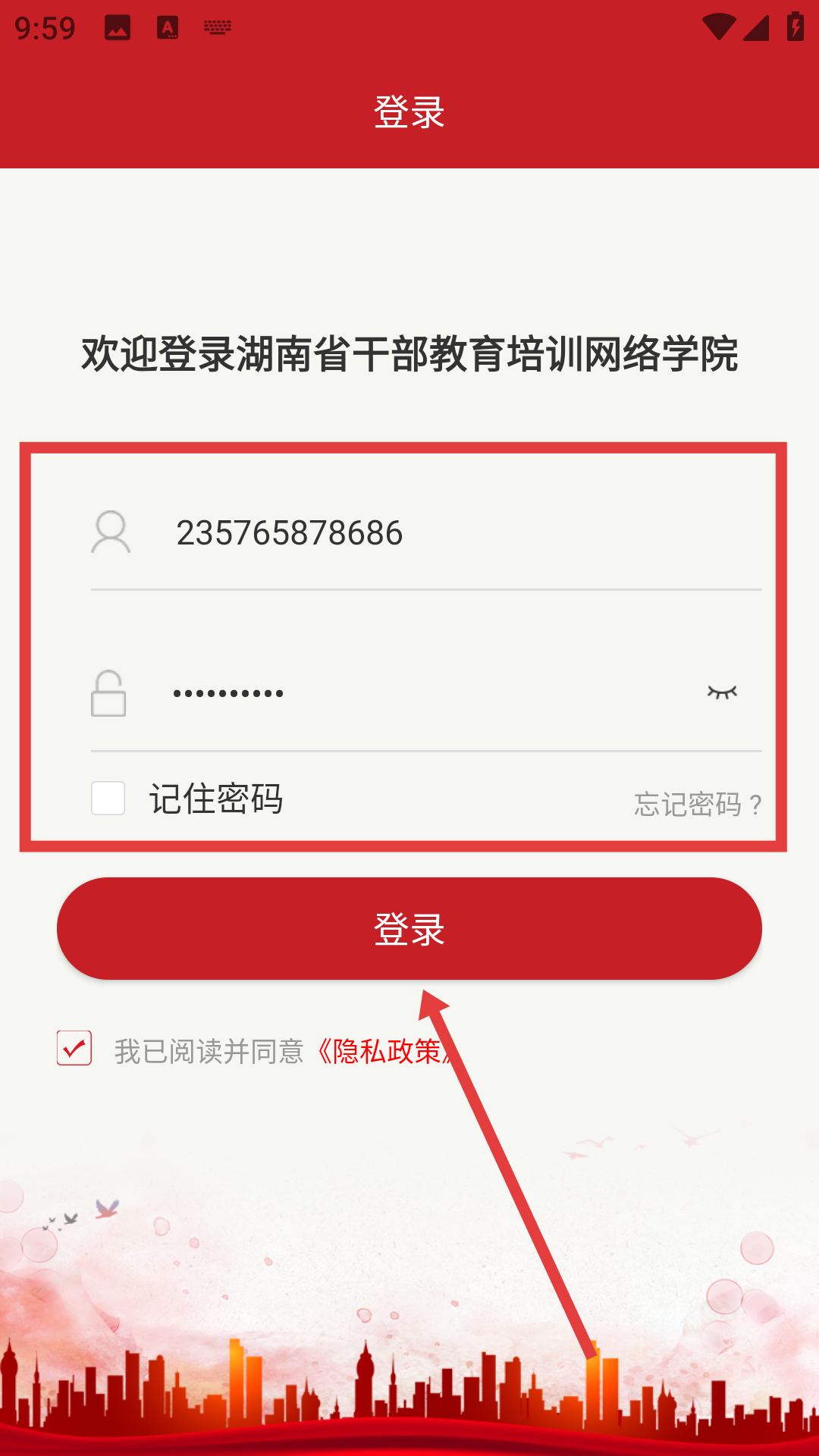 2、在登錄界面,輸入賬號和密碼,勾選同意《隱私政策》后點擊【登錄】。