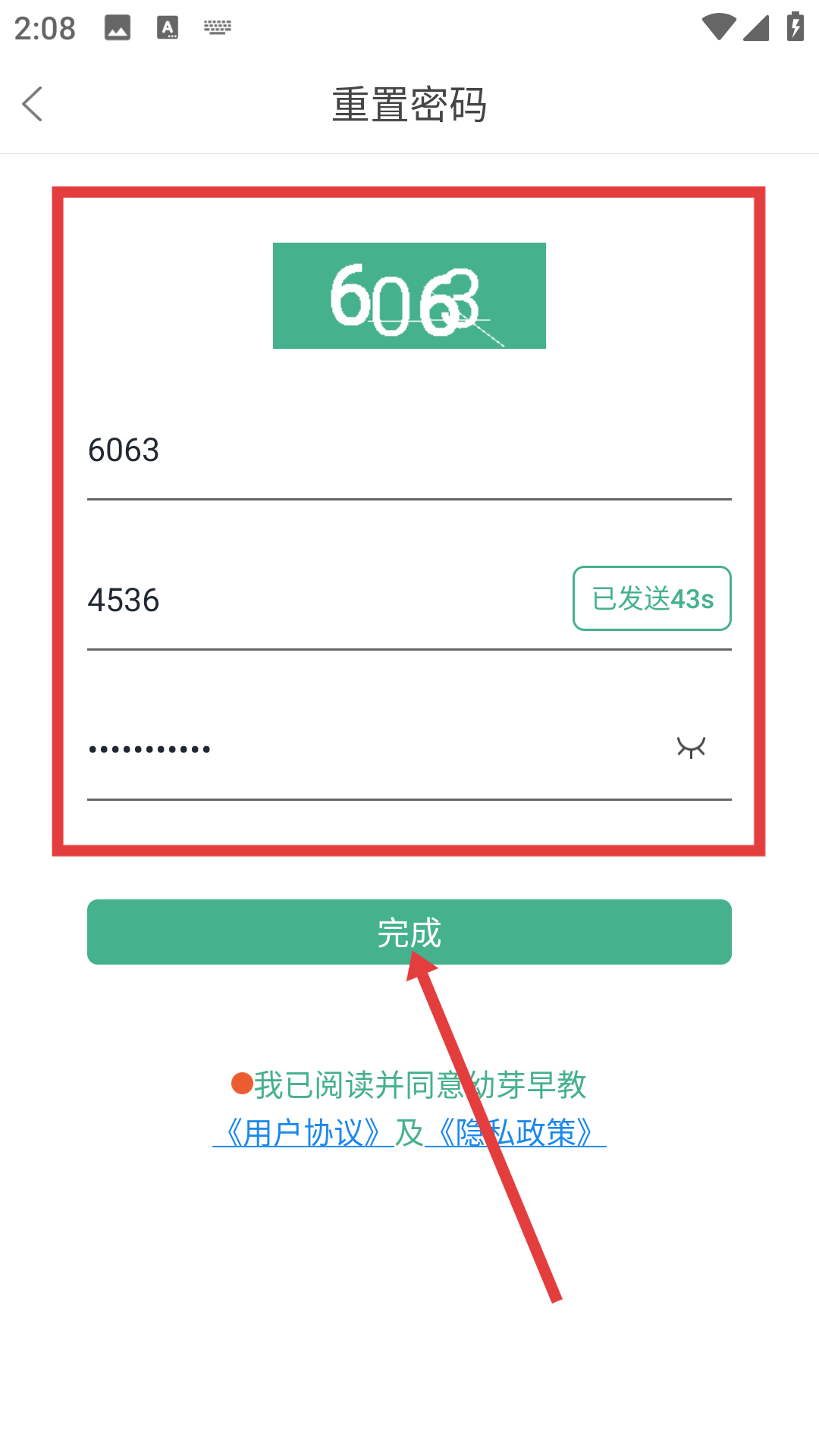 4、在重置密碼界面,依次輸入驗證碼、新密碼等信息后,點擊【完成】按鈕,完成密碼重置操作。