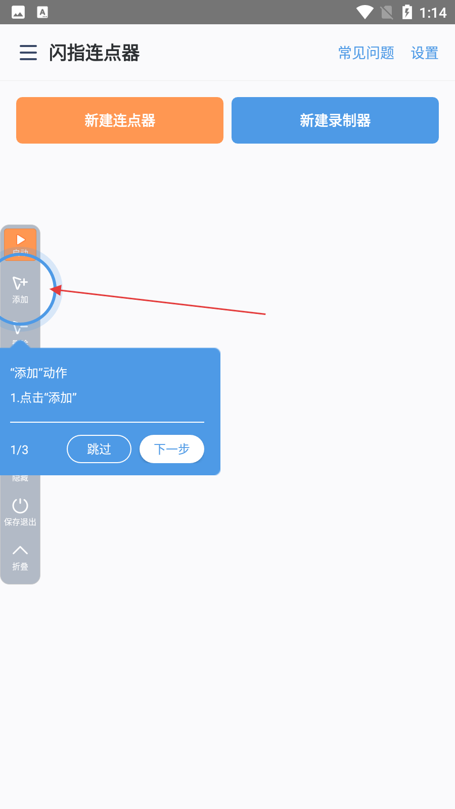 3、啟動連點器后,可根據提示點擊【添加】按鈕,開始添加連點動作,也可選擇跳過提示直接操作。