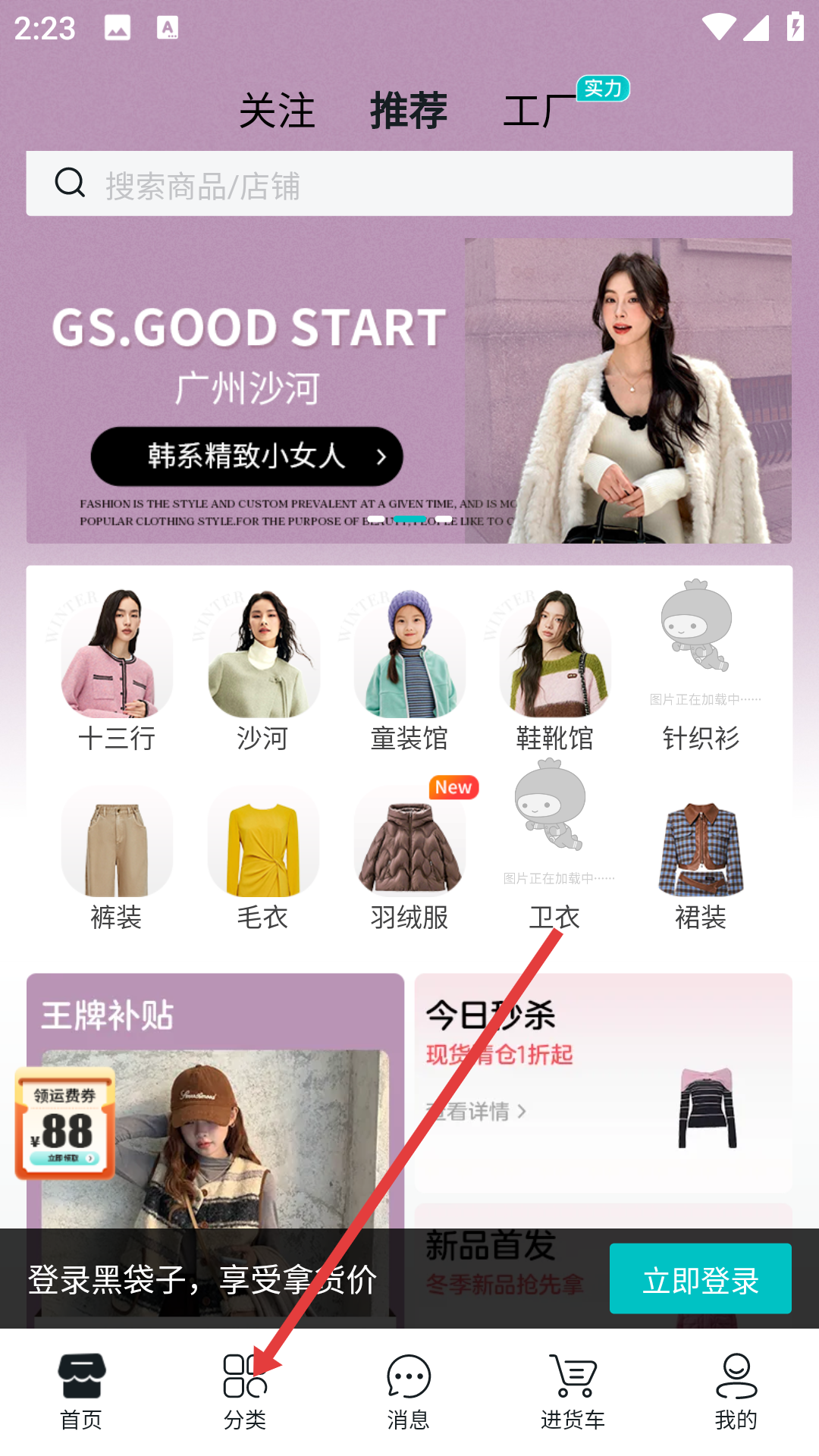 1、在首頁點(diǎn)擊【分類】按鈕,進(jìn)入商品分類頁面后,就能看到女裝、男裝等各類商品的分類入口。