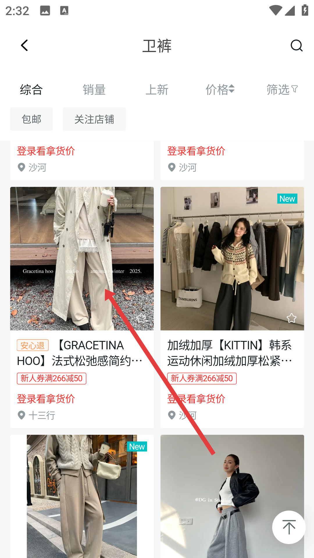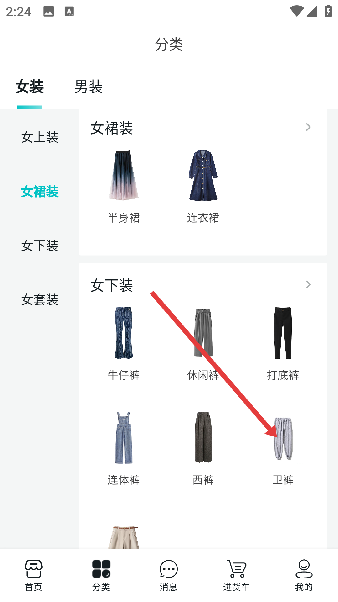2、在分類頁面選擇【女下裝-衛(wèi)褲】分類,進(jìn)入衛(wèi)褲商品列表頁面,可查看不同款式的衛(wèi)褲商品。