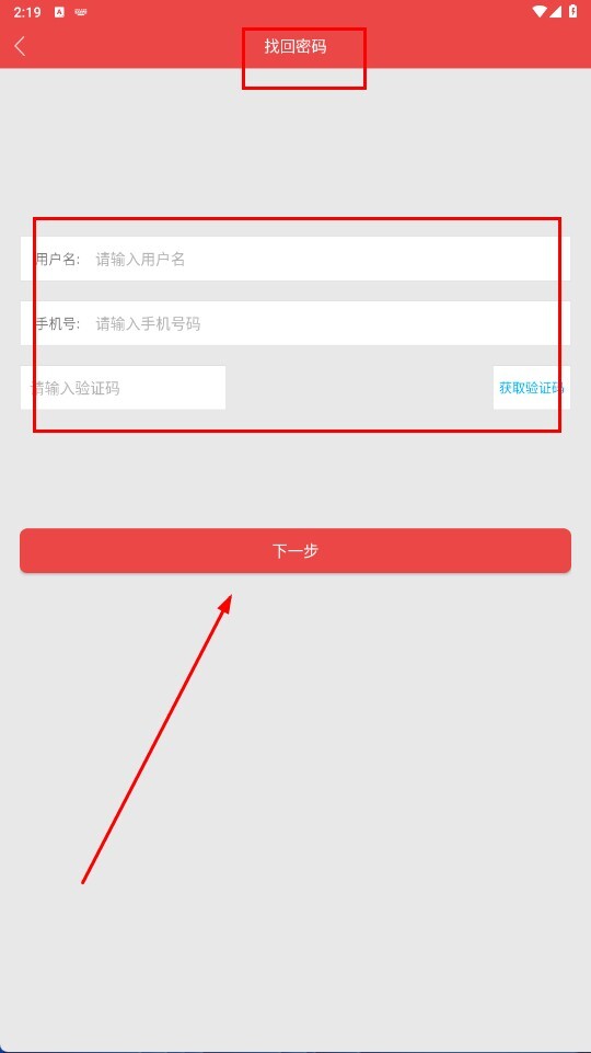 3、在找回密碼頁面,輸入用戶名、手機號并獲取驗證碼后,點擊【下一步】按鈕,可進行密碼找回操作。