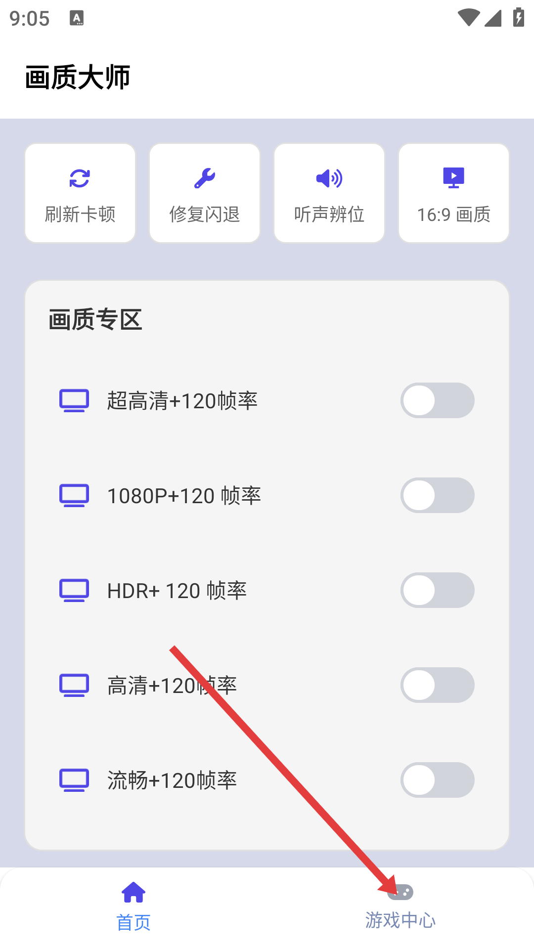 2、進(jìn)入【畫(huà)質(zhì)大師】主界面后,可點(diǎn)擊底部【游戲中心】按鈕,進(jìn)入相關(guān)功能區(qū)域。