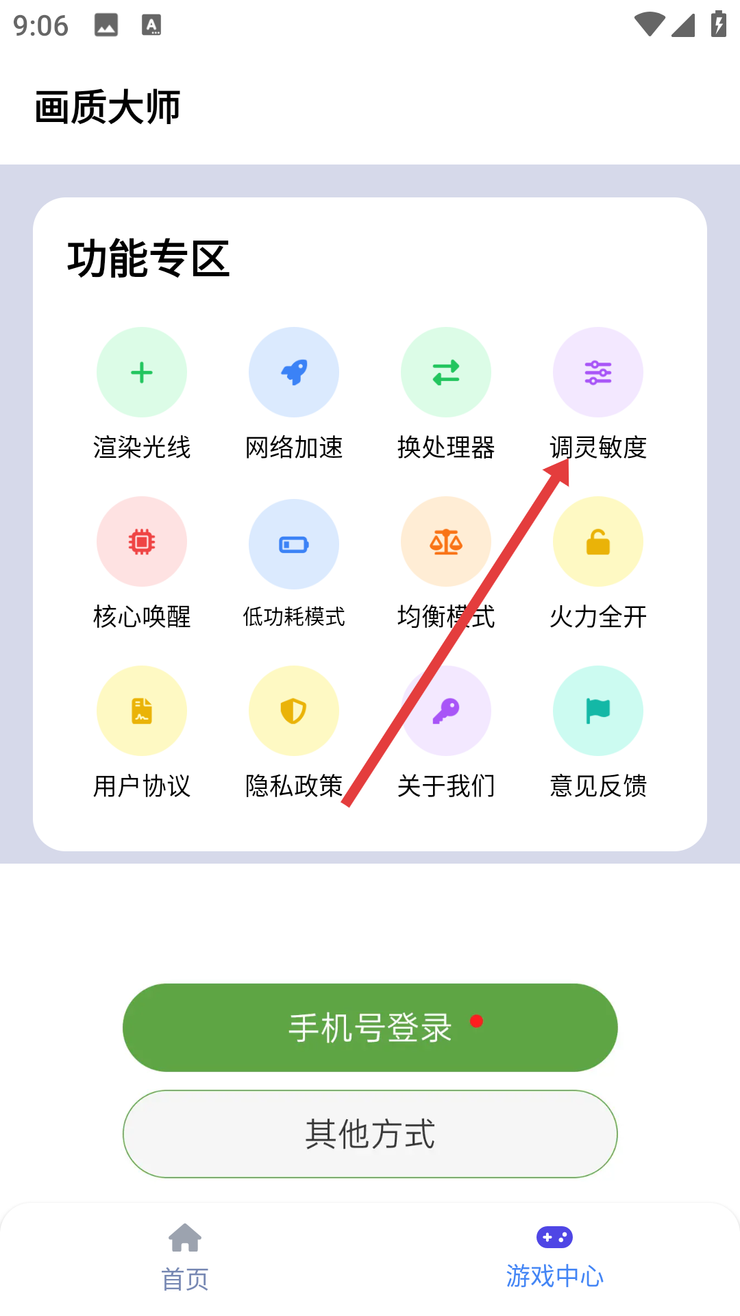 3、在【游戲中心】的【功能專區(qū)】中,找到【調(diào)靈敏度】功能并點(diǎn)擊,可進(jìn)行靈敏度調(diào)節(jié)操作。