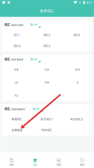 2、在詞匯板塊點(diǎn)擊【必背短語】,進(jìn)入必背短語列表頁面,可查看高考必背短語的不同分組,方便針對性學(xué)習(xí)。