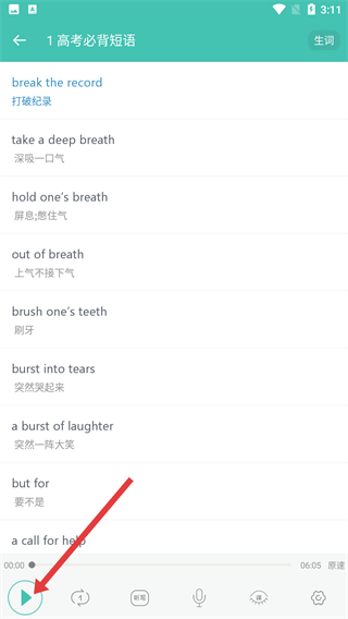 4、在短語詳情頁,點(diǎn)擊底部播放按鈕,可聽短語音頻,結(jié)合【break-the-record-打破紀(jì)錄】等短語的中英釋義,提升英語短語的聽記能力。