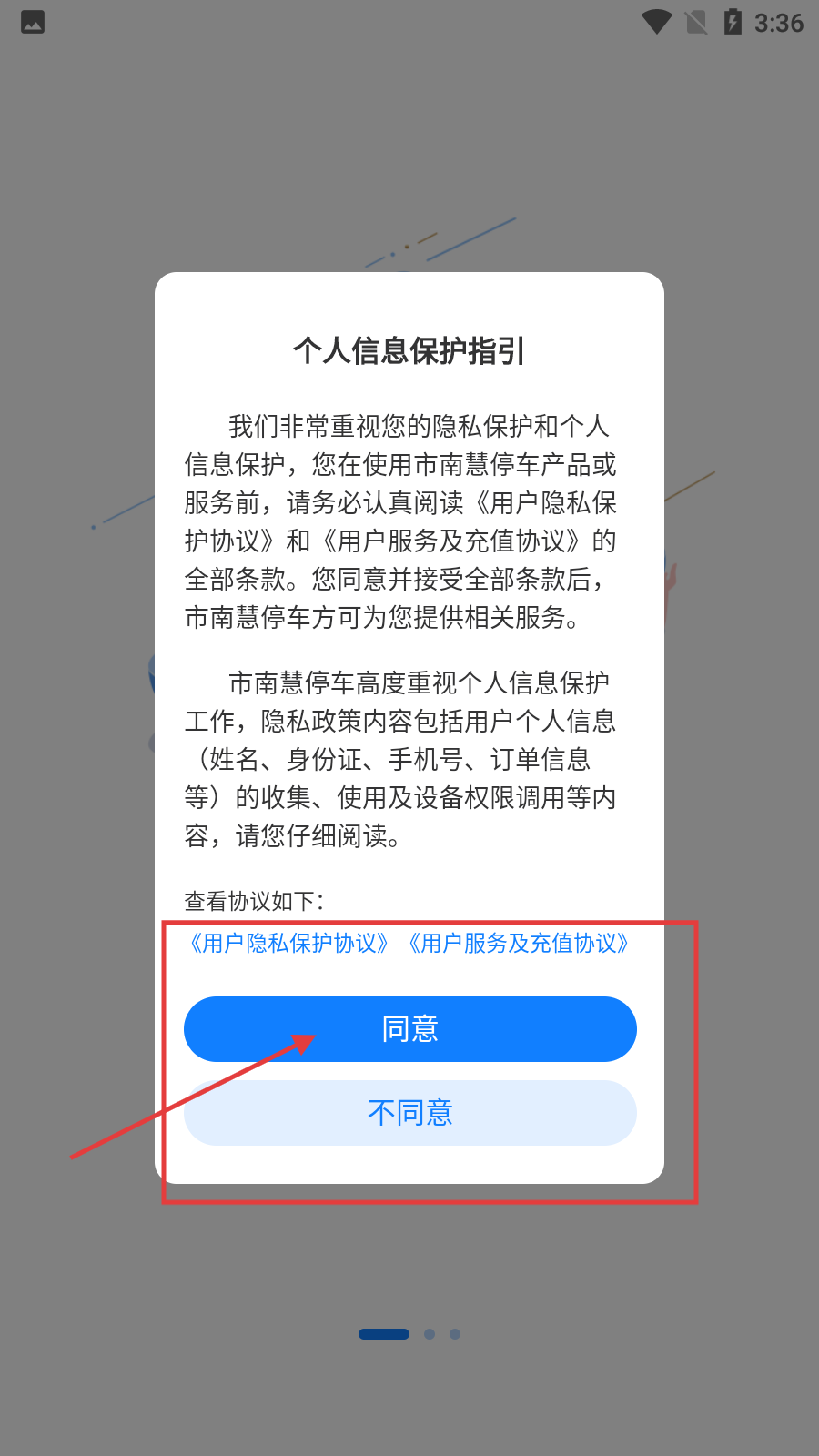 在使用【市南慧停車】服務(wù)前,需點擊【同意】按鈕以獲取服務(wù)使用權(quán)限。