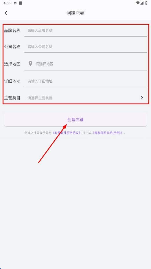4、填寫品牌名稱、公司名稱、地區(qū)、詳細(xì)地址、主營(yíng)類目等信息后,點(diǎn)擊【創(chuàng)建店鋪-功能按鈕】完成店鋪創(chuàng)建。