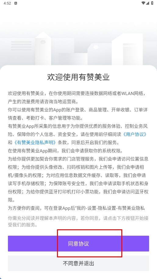 1、點(diǎn)擊【同意協(xié)議-功能按鈕】,以此確認(rèn)同意有贊美業(yè)的用戶協(xié)議及隱私聲明。