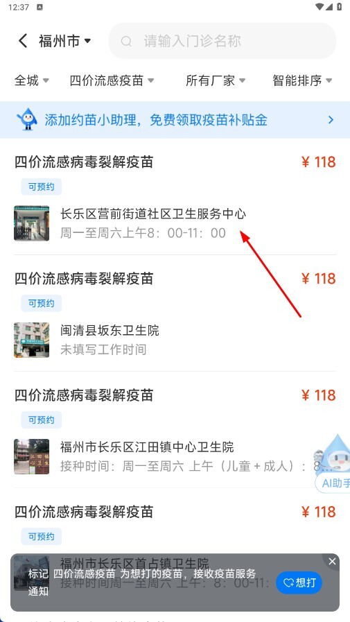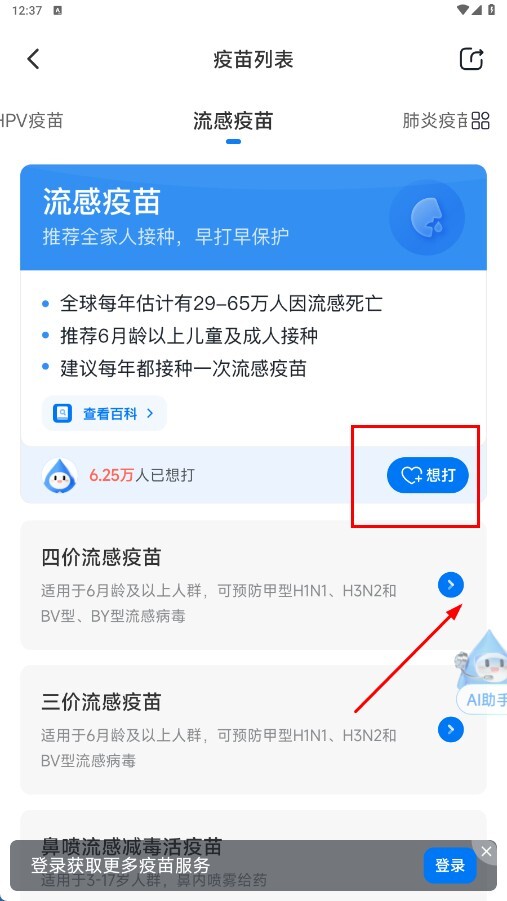 2、在流感疫苗列表頁面,可點擊【想打-功能按鈕】標記,也可選擇具體疫苗類型,如【四價流感疫苗-疫苗類型】。