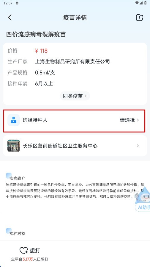 4、進入疫苗詳情頁面,點擊【選擇接種人-功能按鈕】,選擇接種人后可進行后續(xù)接種預約操作。